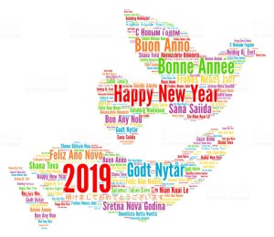 Happy New Year 2019 in different languages illustration